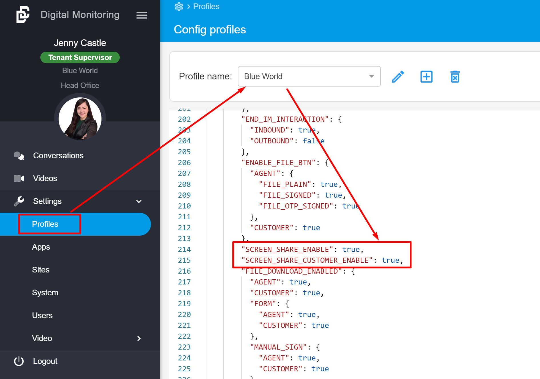 and look for the "SCREEN_SHARE_ENABLE" to enable it from user side, and "SCREEN_SHARE_CUSTOMER_ENABLE" for customer side