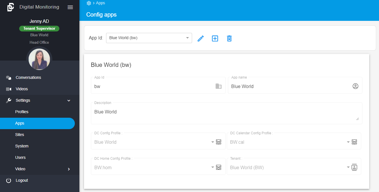 Enter the mandatory information such as App Id, App Name, Description, DC Config Profile and Tenant and/or populate as well the optional fields of Calendar and Home configs and then press Save