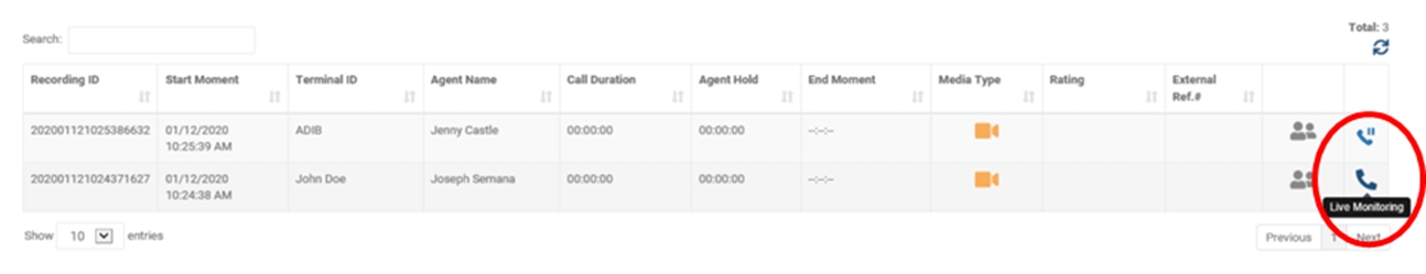 From the main video table, start the live monitoring by clicking the icon ![]()