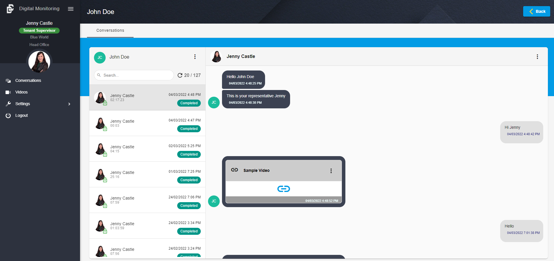 The exchange of activities done in the selected conversation such as chats, shared documents, signed forms and recorded video calls can be viewed here.